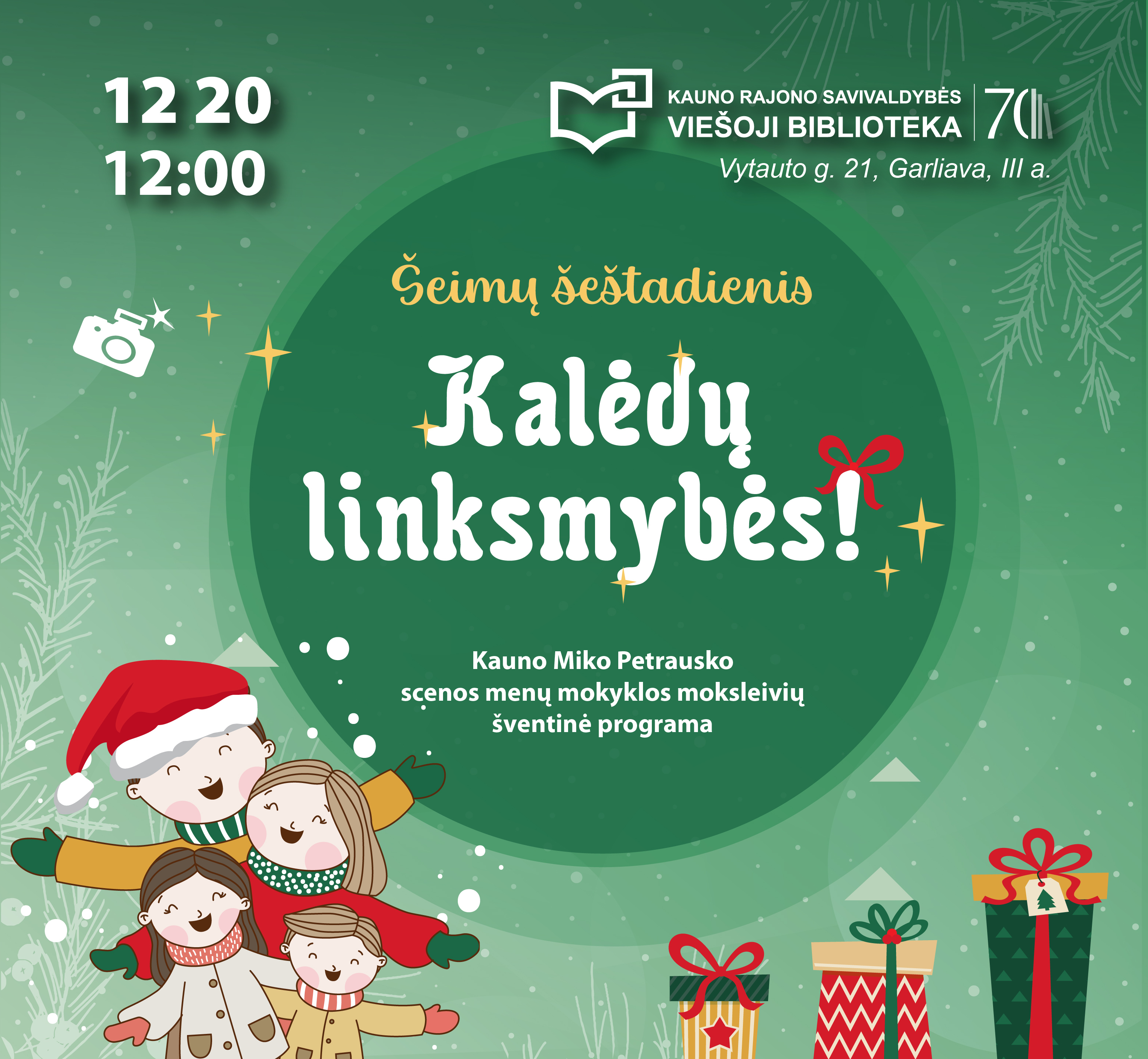 KALĖDŲ LINKSMYBĖS laukia Jūsų gruodžio 20-ąją! Kauno Miko Petrausko scenos menų mokyklos talentingiausi jaunieji menininkai dovanoja Jums šventinę programą Kauno rajono savivaldybės viešojoje bibliotekoje.