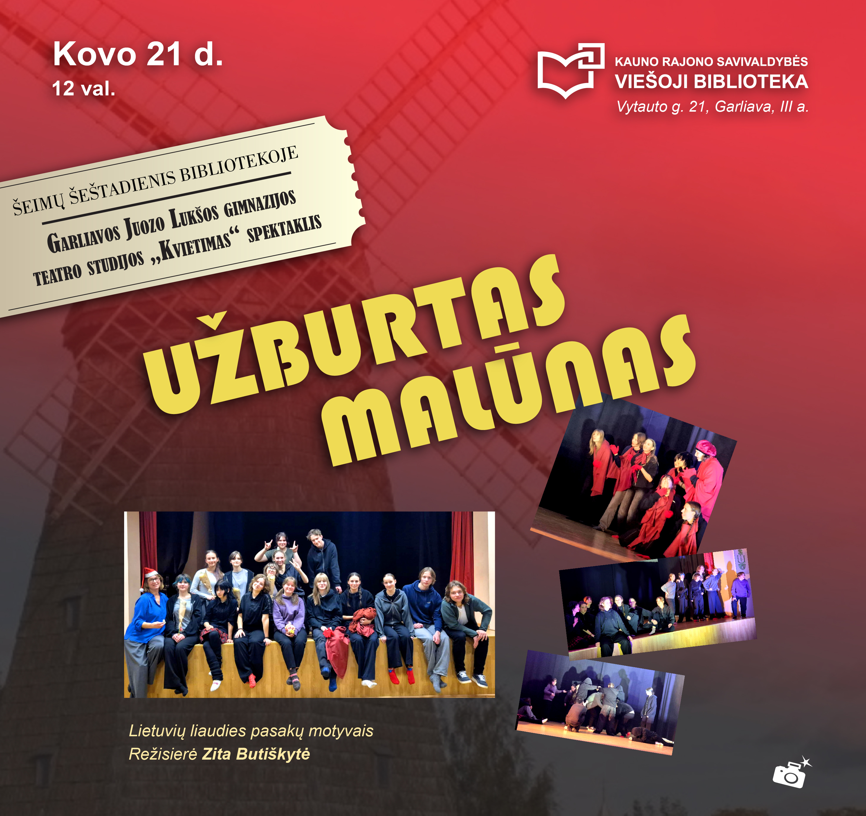 Kovo 21-ąją Šeimų šeštadienis bibliotekoje bus jaukus ir kupinas atradimų. Kviečiame šeimas su draugais ir kaimynais į Garliavos J. Lukšos gimnazijos teatro studijos „Kvietimas“ spektaklį „Užburtas malūnas“, sukurtą lietuvių liaudies pasakos motyvais.