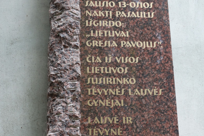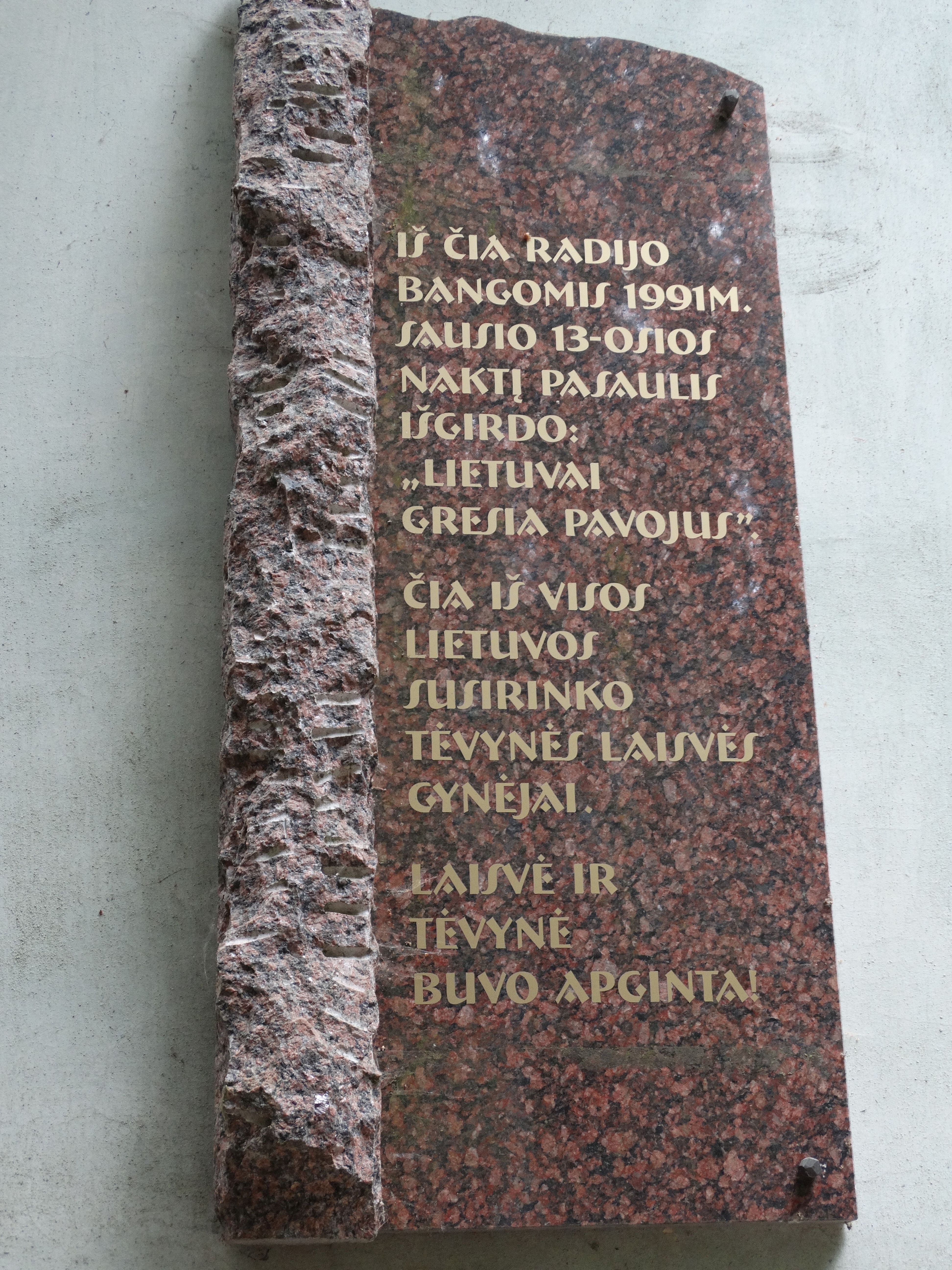 "IŠ ČIA RADIJO BANGOMIS 1991 m. SAUSIO 13-OSIOS NAKTĮ PASAULIS IŠGIRDO: „LIETUVAI GRESIA PAVOJUS“. ČIA IŠ VISOS LIETUVOS SUSIRINKO TĖVYNĖS LAISVĖS GYNĖJAI. LAISVĖ IR TĖVYNĖ BUVO APGINTA."