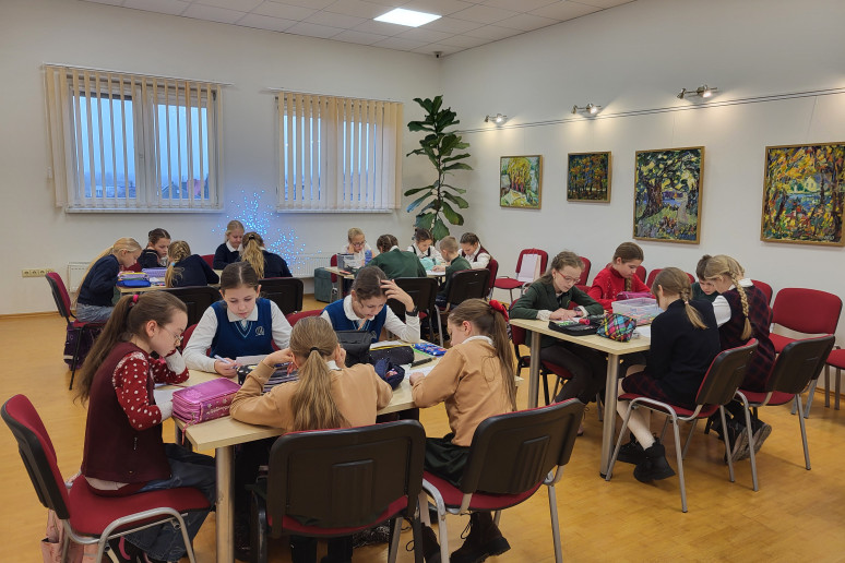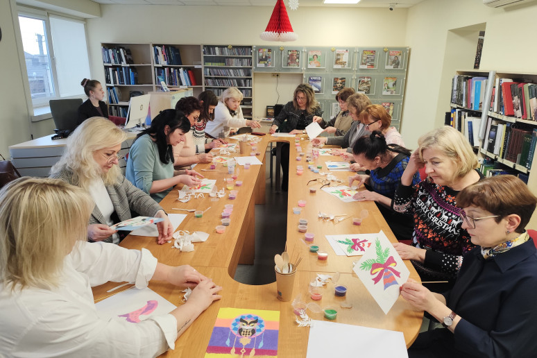 Kol mokiniai užsiėmė kūrybinėmis veiklomis, mokytojos irgi nenuobodžiavo: Kristinos Meilutės vedamose kūrybinėse dirbtuvėse „Tapyba smėliu“ įspūdingai sužibėjo kalėdiniai motyvai.