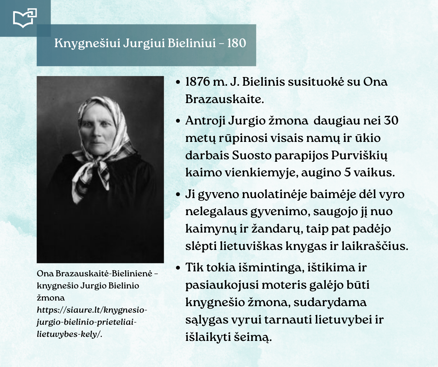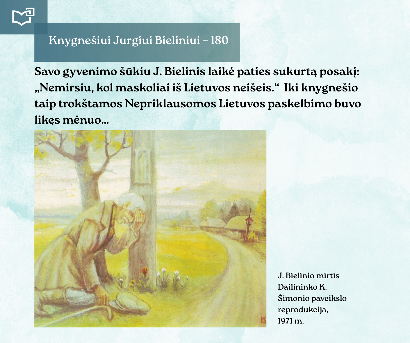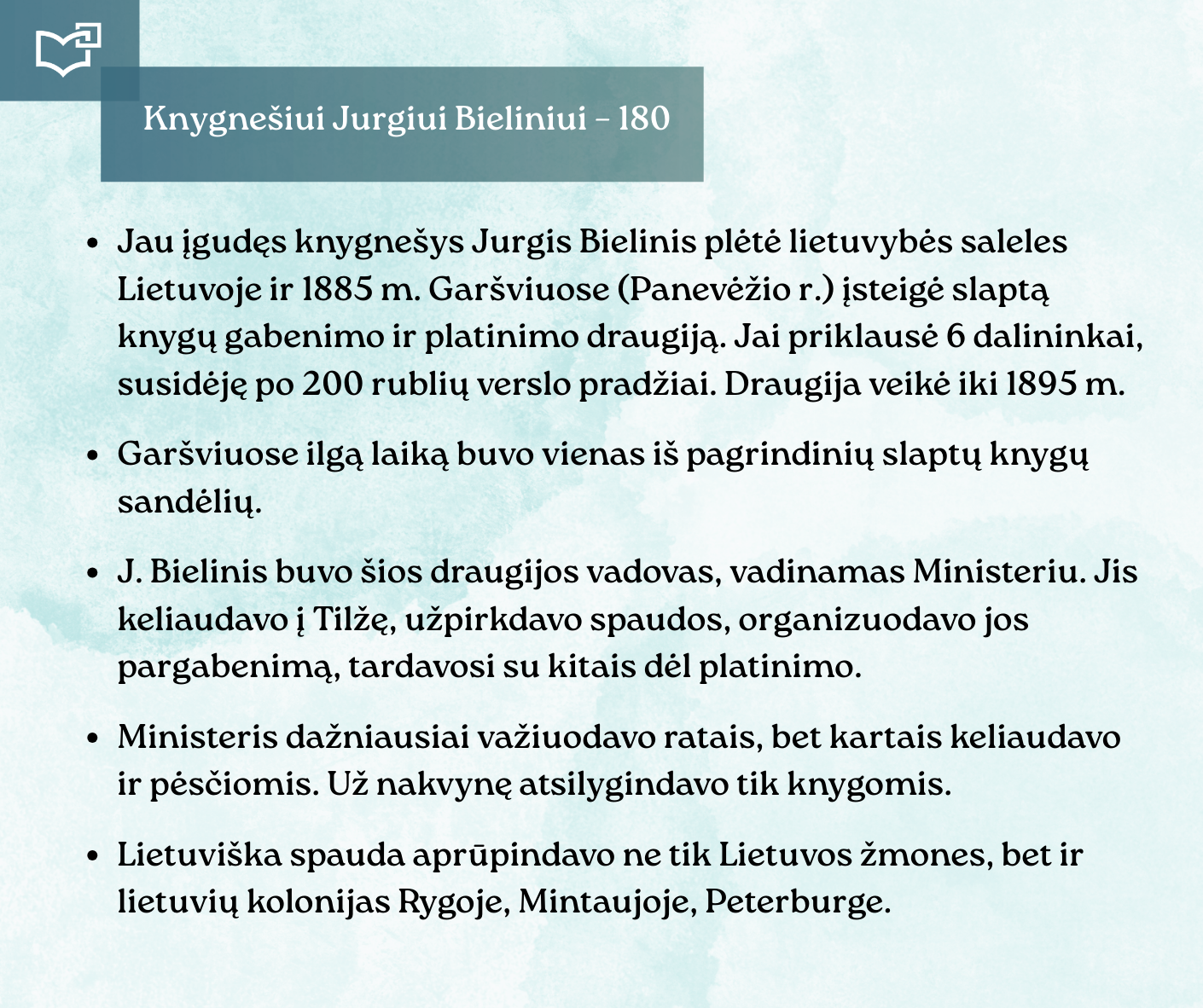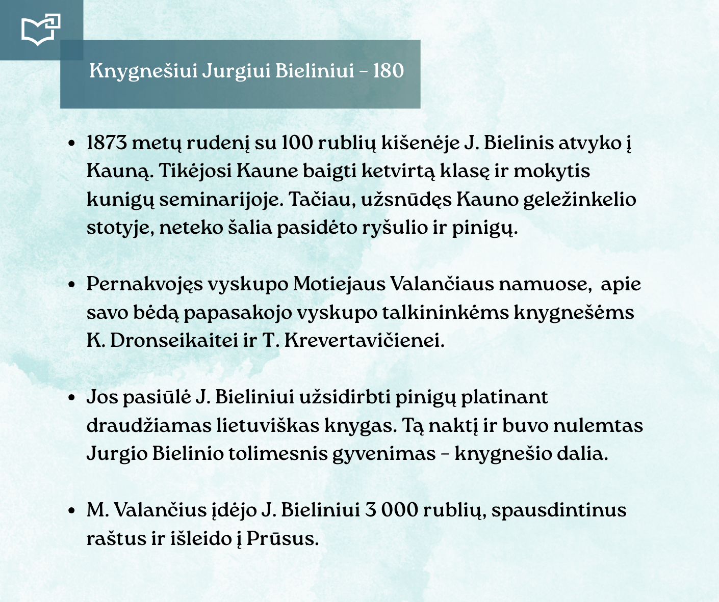 Kovo 16-osios – Knygnešio dienos – ir 180-ųjų Jurgio Bielinio gimimo metinių proga kviečiame Jus susipažinti su nauja virtualia paroda, skirta vienam ryškiausių lietuviško žodžio gynėjų. Kauno rajono savivaldybės viešosios bibliotekos vyr. bibliotekininkė Virginija Tamašauskienė parengė išsamią ekspoziciją, atskleidžiančią J. Bielinio nuopelnus knygnešystei, jo indėlį į tautinio sąmoningumo žadinimą ir kovą už lietuvišką žodį spaudos draudimo metais. Jurgis Bielinis – tai ne tik knygnešys, bet ir švietėjas, organizatorius, drąsuolis, kuriam lietuviškų knygų platinimas tapo gyvenimo misija. Jo veikla įkvėpė šimtus ir padėjo išsaugoti lietuvybę tamsiausiomis tautos istorijos valandomis.